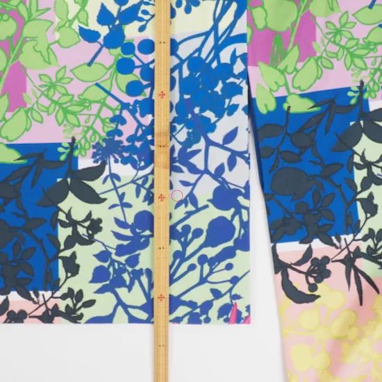 カラフルな幾何学柄の上に、カラフルな植物柄。