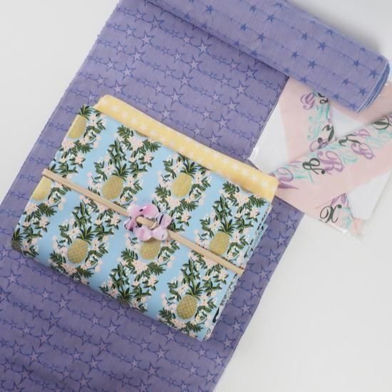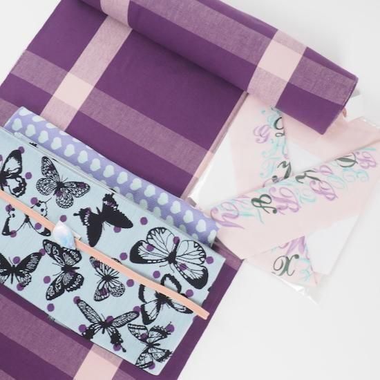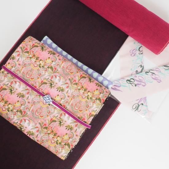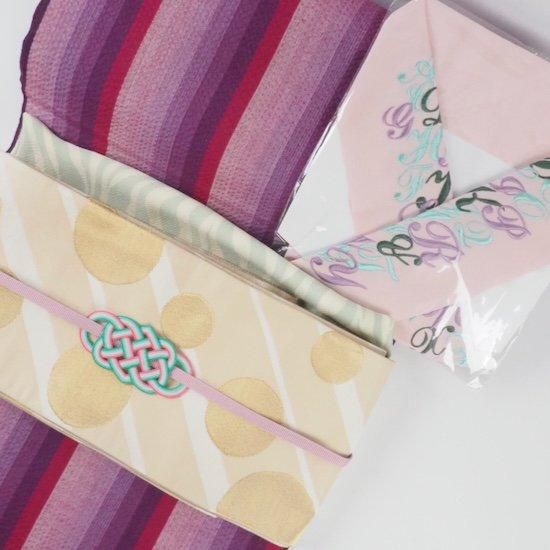 ミントグリーン、パープルの刺繍糸が、カラフルな華やかさをプラス。