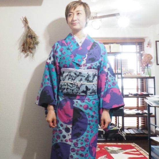 ポリエステルプレタ着物【fruitful】袷、帯揚げ【ハートグラデーション】パープル、funny coco【リバーシブル三分紐】ピーコックブルー×ペールブルー、七宝焼kimito【帯留め 雫型】ホワイト×ゴールド