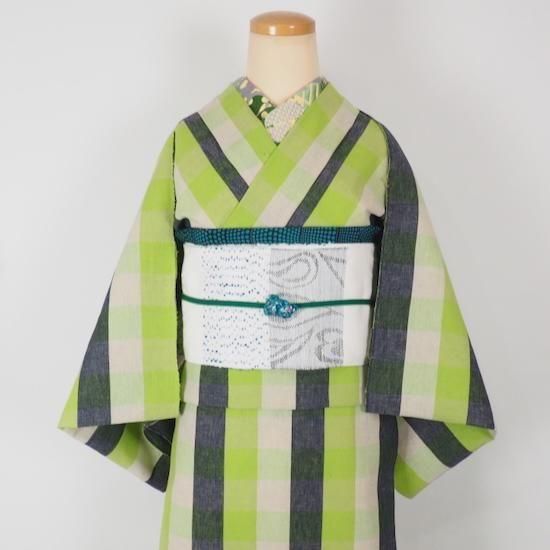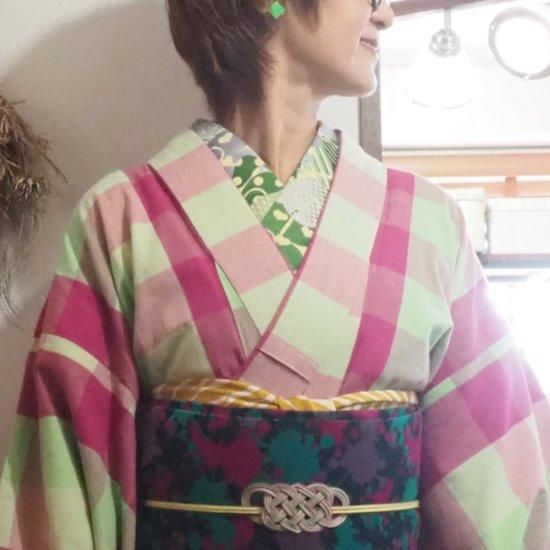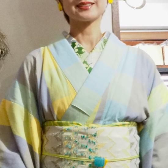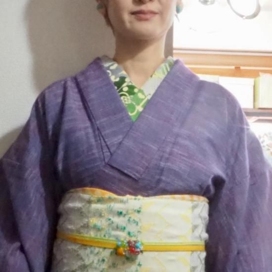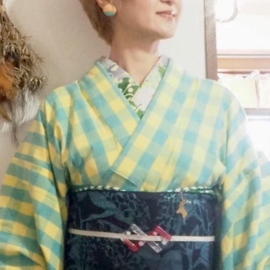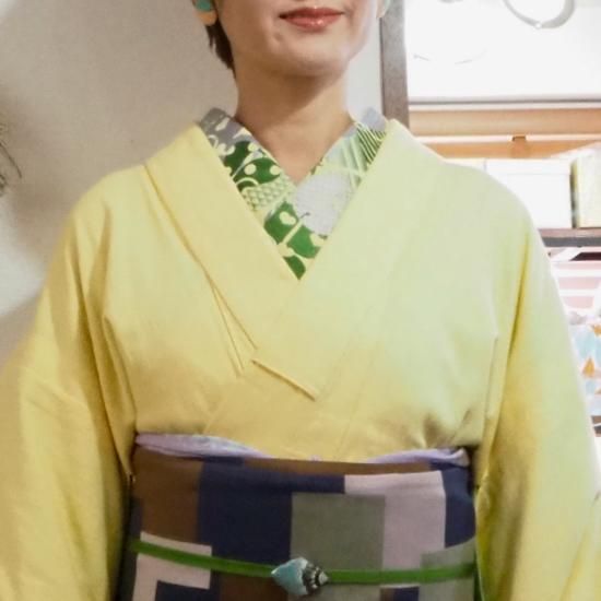 襟元だけ見るとほぼグリーンですが、衣紋はイエローになるので、前と後から見た印象が変わるのも楽しい半襟です。