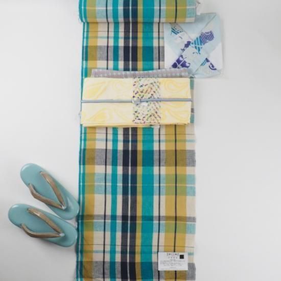 米沢木綿KIPPE 反物【キューカンバー】、帯揚げ【クレイジードット】グラスグリーン、梅屋×衿秀【リバーシブル三分紐】濃淡グリーン、東風杏TONPU-AN 帯留め【ガラス】
