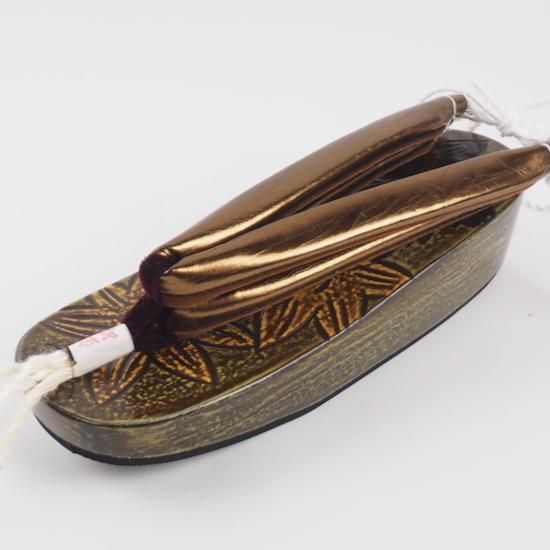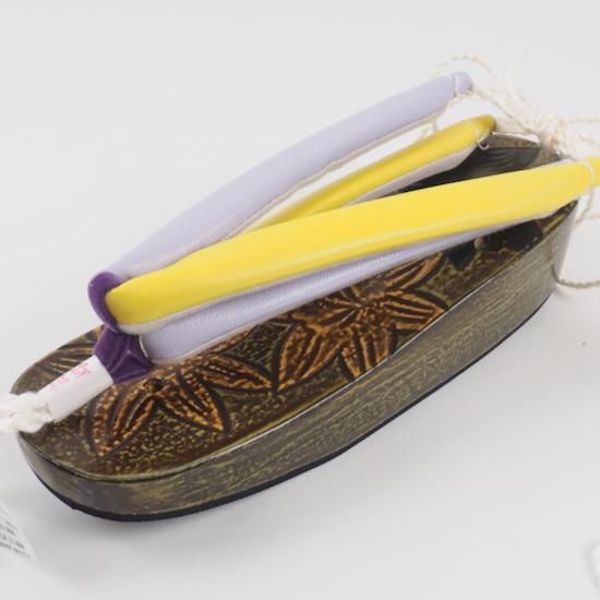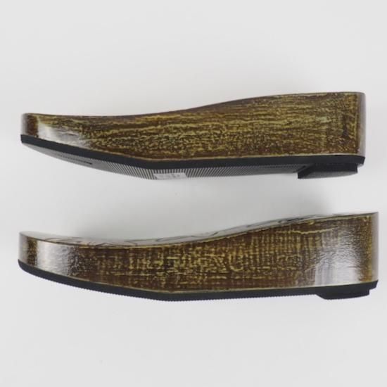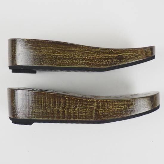 天然漆を何度も塗り重ねるのが本来の方法ですが、天然漆は大変高額なため、下駄に使われる塗料は現在はカシュー(カシューナッツの殻からできた塗料)が主に使われております。カシューナッツは漆科ですが、天然漆と違いかぶれる心配がほとんどありません。