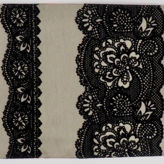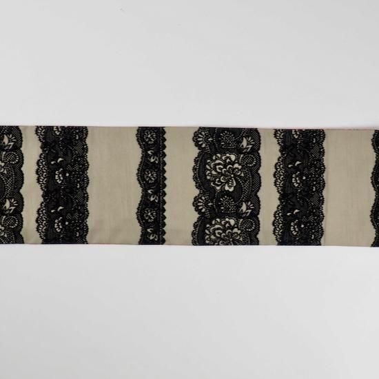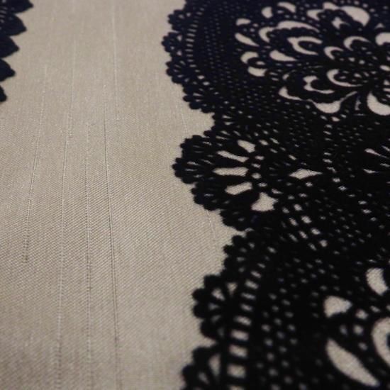シックなベージュ地にブラックのレースがフロッキープリントされた、凝った生地です。