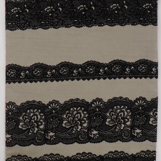 シックなベージュ地にブラックのレースがフロッキープリントされた、凝った生地です。
