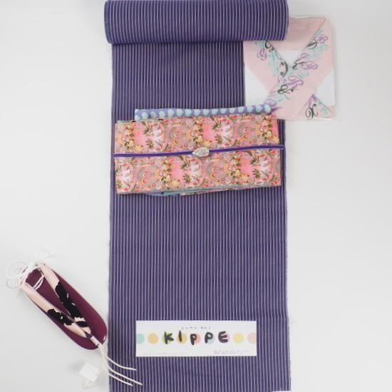 久留米絣(厚地)反物【無地】玉虫ブルー、帯揚げ【ゼブラ】ミント、梅屋×衿秀【リバーシブル三分紐】バイオレット×ペールブルー、kimito 帯留め【七宝焼き】