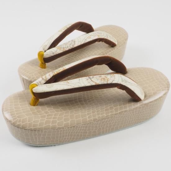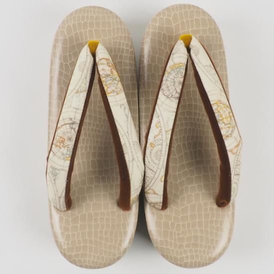 レトロな古地図柄のリバティプリントを挿げて、クラシックな雰囲気をプラスした草履です。