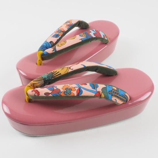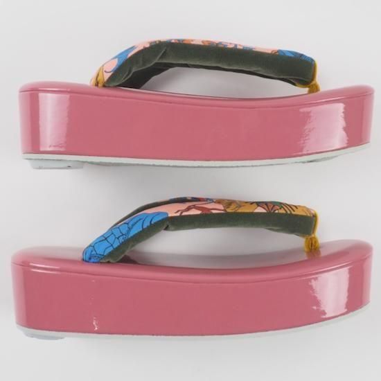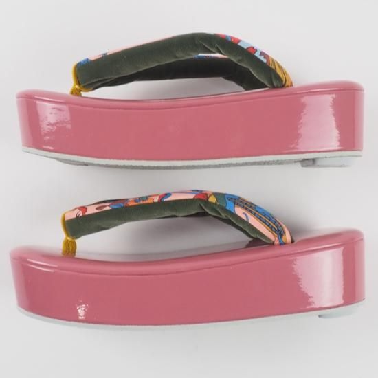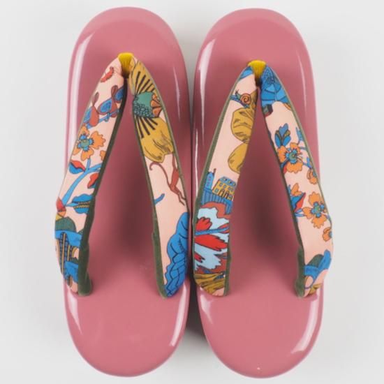 ピンクのエナメル台に、カラフルなリバティ鼻緒を挿げました。