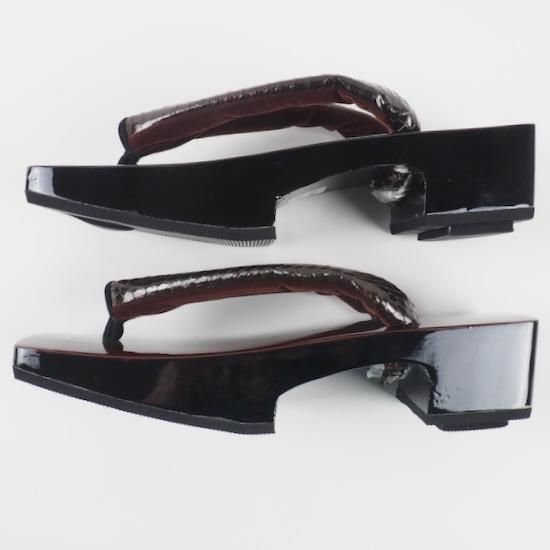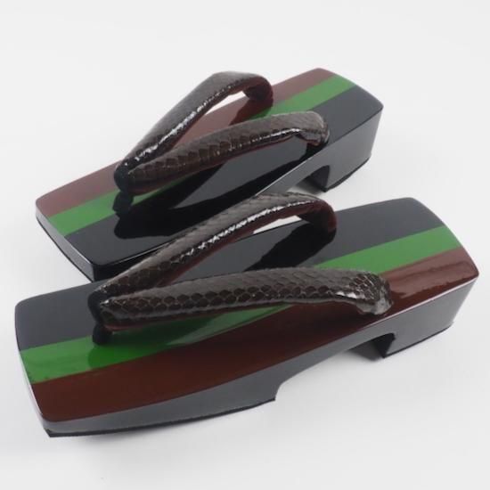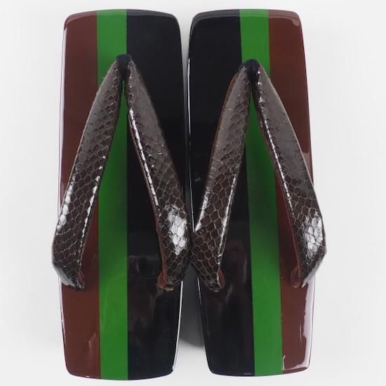 深いブラウンの蛇革鼻緒を挿げて、渋くてクールな下駄に。