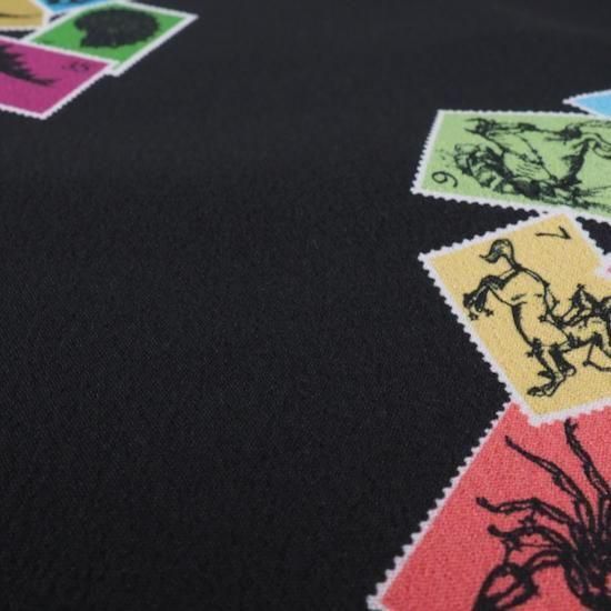 近寄ると、カラフルな切手柄が散りばめられた、遊び心あふれるデザインです。